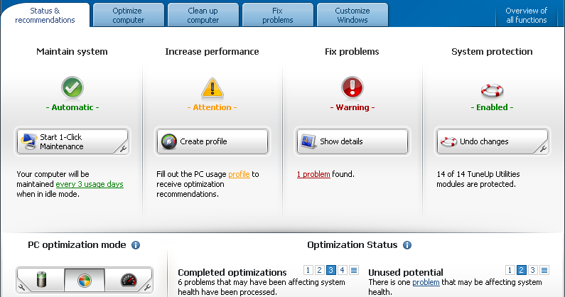 TuneUp Utilities, similar to Advanced Systemcare improves system performance with Disk Cleaner, Registry Cleaner and other tools.